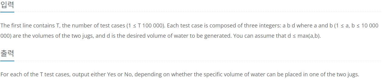 2. a와 b를 이용해 만들 수 있는 수는 a와 b의 최대 공약수의 배수이면서 a와 b 중 더 큰 값보다 작거나 같은 수이므로 d가 a와 b의 최대공약수의 배수이면 Yes를 아니라면 No를 출력합니다.
