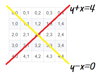 또한 대각선 방향의 좌표들의 특성은 아래와 같기 때문에 up [y+x], down [y-x+N-1]을 각각 저장해 주어 퀸의 대각선 방향에 다른 퀸이 있는지 체크할 수 있습니다.