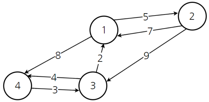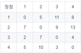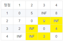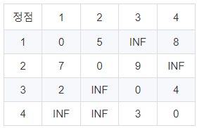 위와 같은 그래프가 존재할 때 각 정점에서부터 정점에서까지의 거리를 2차원 배열로 나타내면 다음과 같습니다.