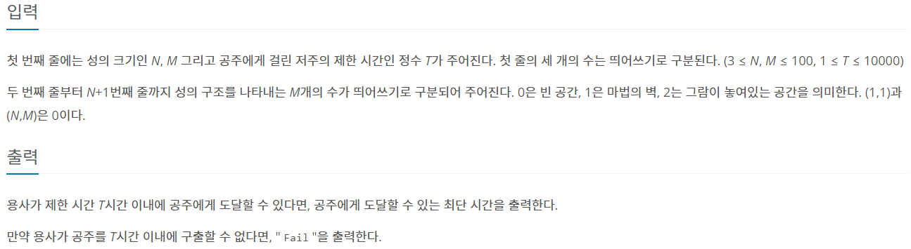 1 2 3 4 5 6 7 8 9 10 11 12 13 14 15 16 17 18 19 20 21 22 23 24 25 26 27 28 29 30 31 32 33 34 35 36 37 38 39 40 41 42 43 44 45 46 47 48 49 50 51 52 53 54 55 56 57 58 59 60 61 62 63 64 65 66 67 68 69 70 | #include<iostream> #include<queue> using namespace std; int N, M, T; int arr[101][101]; int visited[101][101][2]; int dy[4] = { -1,1,0,0 }; int dx[4] = { 0,0,-1,1 }; struct node { int y; int x; int cnt; int gram; }; int main() { scanf("%d %d %d", &N, &M, &T); for (int i = 1; i <= N; i++) { for (int j = 1; j <= M; j++) { scanf("%d", &arr[i][j]); } } queue<node> q; q.push({ 1,1,0,false }); visited[1][1][0] = 1; while (!q.empty()) { const int y = q.front().y; const int x = q.front().x; const int cnt = q.front().cnt; const int gram = q.front().gram; q.pop(); if (cnt > T) continue; if (y == N && x == M) { printf("%d", cnt); return 0; } for (int i = 0; i < 4; i++) { const int yy = y + dy[i]; const int xx = x + dx[i]; if (yy > 0 && yy <= N && xx > 0 && xx <= M) { if ((arr[yy][xx] == 1 && gram == true) || arr[yy][xx] == 0) { if (visited[yy][xx][gram] != 1) { visited[yy][xx][gram] = 1; q.push({ yy,xx,cnt + 1,gram }); } } else if (arr[yy][xx] == 2) { if (visited[yy][xx][1] != 1) { visited[yy][xx][1] = 1; q.push({ yy,xx,cnt + 1,1 }); } } } } } printf("Fail"); } | cs |