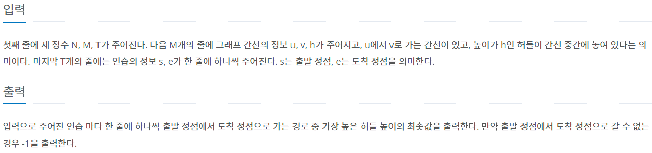 1 2 3 4 5 6 7 8 9 10 11 12 13 14 15 16 17 18 19 20 21 22 23 24 25 26 27 28 29 30 31 32 33 34 35 36 37 38 39 40 41 42 43 44 | #include<iostream> using namespace std; int N, M, T; int arr[301][301]; int main() { scanf("%d %d %d", &N, &M, &T); for (int i = 1; i <= N; i++) { for (int j = 1; j <= N; j++) { arr[i][j] = 987654321; } } for (int i = 0; i < M; i++) { int u, v, h; scanf("%d %d %d", &u, &v, &h); arr[u][v] = h; } for (int i = 1; i <= N; i++) { for (int j = 1; j <= N; j++) { for (int k = 1; k <= N; k++) { arr[j][k] = min(arr[j][k], max(arr[j][i], arr[i][k])); } } } for (int i = 0; i < T; i++) { int u, v; scanf("%d %d", &u, &v); if (arr[u][v] == 987654321) { printf("-1\n"); } else { printf("%d\n", arr[u][v]); } } } | cs |