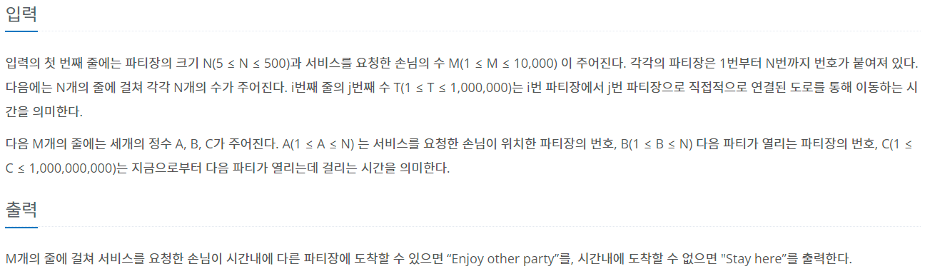 1 2 3 4 5 6 7 8 9 10 11 12 13 14 15 16 17 18 19 20 21 22 23 24 25 26 27 28 29 30 31 32 33 34 35 36 37 | #include<iostream> using namespace std; int N, M; int arr[501][501]; int main() { scanf("%d %d", &N, &M); for (int i = 1; i <= N; i++) { for (int j = 1; j <= N; j++) { scanf("%d", &arr[i][j]); } } for (int i = 1; i <= N; i++) { for (int j = 1; j <= N; j++) { for (int k = 1; k <= N; k++) { arr[j][k] = min(arr[j][k], arr[j][i] + arr[i][k]); } } } for (int i = 0; i < M; i++) { int A, B, C; scanf("%d %d %d", &A, &B, &C); if (arr[A][B] > C) { printf("Stay here\n"); } else { printf("Enjoy other party\n"); } } } | cs |