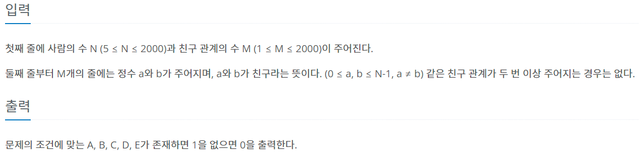 1 2 3 4 5 6 7 8 9 10 11 12 13 14 15 16 17 18 19 20 21 22 23 24 25 26 27 28 29 30 31 32 33 34 35 36 37 38 39 40 41 42 43 44 45 46 47 48 49 50 | #include<iostream> #include<vector> using namespace std; int N, M; int ans; vector<int> list[2000]; int visited[2000]; void dfs(int cur, int cnt) { ans = max(ans, cnt); if (ans > 4) return; cnt++; for (auto& next : list[cur]) { if (visited[next] != 1) { visited[next] = 1; dfs(next, cnt); visited[next] = 0; } } } int main() { scanf("%d %d", &N, &M); for (int i = 0; i < M; i++) { int a, b; scanf("%d %d", &a, &b); list[a].push_back(b); list[b].push_back(a); } for (int i = 0; i < N; i++) { fill(visited, visited + N, 0); visited[i] = 1; dfs(i, 1); } if (ans > 4) { printf("1"); } else{ printf("0"); } } | cs |