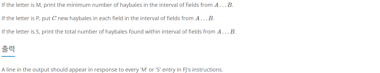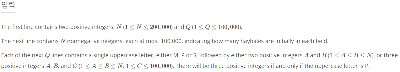 1 2 3 4 5 6 7 8 9 10 11 12 13 14 15 16 17 18 19 20 21 22 23 24 25 26 27 28 29 30 31 32 33 34 35 36 37 38 39 40 41 42 43 44 45 46 47 48 49 50 51 52 53 54 55 56 57 58 59 60 61 62 63 64 65 66 67 68 69 70 71 72 73 74 75 76 77 78 79 80 81 82 83 84 85 86 87 88 89 90 91 92 93 94 95 96 97 98 99 100 101 102 103 104 105 106 107 108 109 110 111 112 113 114 115 116 117 118 119 120 121 122 123 124 125 126 127 128 129 130 131 132 133 134 135 136 | #include<iostream> #define ll long long using namespace std; struct node { ll sum; ll min; }; int N, Q; int arr[200001]; node segTree[524300]; ll lazy[524300]; void updateLazy(int node, int s, int e) { if (lazy[node]) { segTree[node].sum += lazy[node] * (1LL * e - s + 1); segTree[node].min += lazy[node]; if (s != e) { lazy[node * 2] += lazy[node]; lazy[node * 2 + 1] += lazy[node]; } lazy[node] = 0; } return; } void makeTree(int node, int s, int e) { if (s == e) { segTree[node].sum = 1LL * arr[s]; segTree[node].min = 1LL * arr[s]; return; } int m = (s + e) / 2; makeTree(node * 2, s, m); makeTree(node * 2 + 1, m + 1, e); segTree[node].sum = segTree[node * 2].sum + segTree[node * 2 + 1].sum; segTree[node].min = min(segTree[node * 2].min, segTree[node * 2 + 1].min); return; } void updateTree(int node, int s, int e, int sidx, int eidx, int C) { updateLazy(node, s, e); if (s > eidx || e < sidx) return; if (sidx <= s && e <= eidx) { segTree[node].sum += (1LL * e - s + 1) * (1LL * C); segTree[node].min += C; if (s != e) { lazy[node * 2] += C; lazy[node * 2 + 1] += C; } return; } int m = (s + e) / 2; updateTree(node * 2, s, m, sidx, eidx, C); updateTree(node * 2 + 1, m + 1, e, sidx, eidx, C); segTree[node].sum = segTree[node * 2].sum + segTree[node * 2 + 1].sum; segTree[node].min = min(segTree[node * 2].min, segTree[node * 2 + 1].min); return; } ll getSum(int node, int s, int e, int sidx, int eidx) { updateLazy(node, s, e); if (s > eidx || e < sidx) return 0; if (sidx <= s && e <= eidx) return segTree[node].sum; int m = (s + e) / 2; return getSum(node * 2, s, m, sidx, eidx) + getSum(node * 2 + 1, m + 1, e, sidx, eidx); } ll getMin(int node, int s, int e, int sidx, int eidx) { updateLazy(node, s, e); if (s > eidx || e < sidx) return 11111111111; if (sidx <= s && e <= eidx) return segTree[node].min; int m = (s + e) / 2; return min(getMin(node * 2, s, m, sidx, eidx), getMin(node * 2 + 1, m + 1, e, sidx, eidx)); } int main() { ios_base::sync_with_stdio(false); cin.tie(NULL); cout.tie(NULL); cin >> N >> Q; for (int i = 1; i <= N; i++) { cin >> arr[i]; } makeTree(1, 1, N); for (int i = 0; i < Q; i++) { char cmd; int A, B; cin >> cmd >> A >> B; if (cmd == 'M') { cout << getMin(1, 1, N, A, B) << '\n'; } else if (cmd == 'P') { int C; cin >> C; updateTree(1, 1, N, A, B, C); } else { cout << getSum(1, 1, N, A, B) << '\n'; } } } | cs |