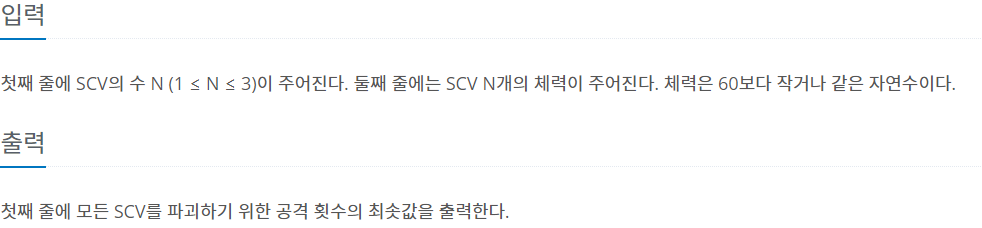 1. SCV[ 61 ][ 61 ][ 61 ] 배열을 만들어 각각의 SCV의 체력에 따라 최소의 공격 횟수를 저장합니다.