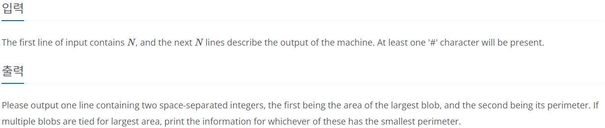 2. 모든 좌표를 돌면서 해당 좌표가 #이고 방문하지 않았다면 bfs를 통해 블롭의 개수와 둘레 길이를 저장합니다.
