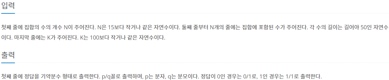 1 2 3 4 5 6 7 8 9 10 11 12 13 14 15 16 17 18 19 20 21 22 23 24 25 26 27 28 29 30 31 32 33 34 35 36 37 38 39 40 41 42 43 44 45 46 47 48 49 50 51 52 53 54 55 56 57 58 59 60 61 62 63 64 65 66 67 68 69 70 71 72 73 74 75 76 77 78 79 80 81 82 83 84 85 86 87 88 89 90 91 92 93 94 95 96 97 98 99 100 101 102 103 104 105 106 107 108 | #include<iostream> #include<string> #include<cstring> #define ll long long using namespace std; int N, K; string arr[16]; ll dp[1 << 15][100]; int mods[15]; int digit[51]; ll GCD(ll a, ll b) //최대 공약수 구하기 { while (a != 0) { ll temp = b % a; b = a; a = temp; } return b; } int mod(string num) //입력된 숫자를 K로 나눈 나머지 구하기 { int ret = 0; for (int i = 0; i < num.size(); i++) { ret = (ret * 10) % K + (num[i] - '0') % K; ret %= K; } return ret; } ll Fac(int num) //팩토리얼 { ll ret = 1; for (int i = 1; i <= num; i++) { ret *= i; } return ret; } ll DP(int cur, int mod) //나머지별로 개수 저장 { if (cur == (1 << N) - 1) { //모든 수를 썼는가? if (mod == 0) return 1; else return 0; } ll& ret = dp[cur][mod]; if (ret != -1) return dp[cur][mod]; //사용된 적이 있는가? ret = 0; for (int i = 0; i < N; i++) { int mask = 1 << i; if (cur & mask) continue; //이미 사용된 숫자면 continue ret += DP(cur | mask, ((mod * digit[arr[i].size()]) % K + mods[i]) % K); } return ret; } int main() { memset(dp, -1, sizeof(dp)); digit[0] = 1; cin >> N; for (int i = 0; i < N; i++) { cin >> arr[i]; } cin >> K; for (int i = 0; i < N; i++) { mods[i] = mod(arr[i]); } for (int i = 1; i <= 50; i++) { digit[i] = ((digit[i - 1] % K) * (10 % K)) % K; } ll numerator = DP(0, 0); //분자 ll denominator = Fac(N); //분모 if (numerator == 0) { cout << "0/1"; return 0; } if (numerator == denominator) { cout << "1/1"; return 0; } ll gcd = GCD(numerator, denominator); cout << numerator / gcd << "/" << denominator / gcd; } | cs |