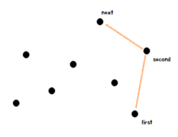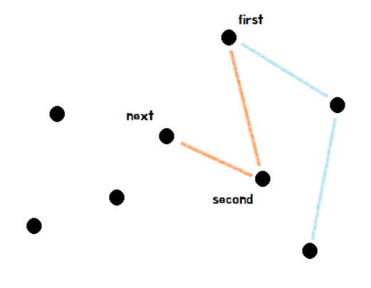 이번에는 first - second 직선보다 first - next 직선이 오른쪽에 있으므로 ccw 값은 0보다 작게 나옵니다. 그렇다면 second 점은 볼록 껍질의 점이 될 수 없으므로 second는 다시 스택에 넣지 않고 위 과정을 반복합니다.