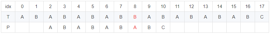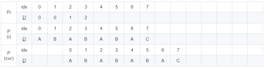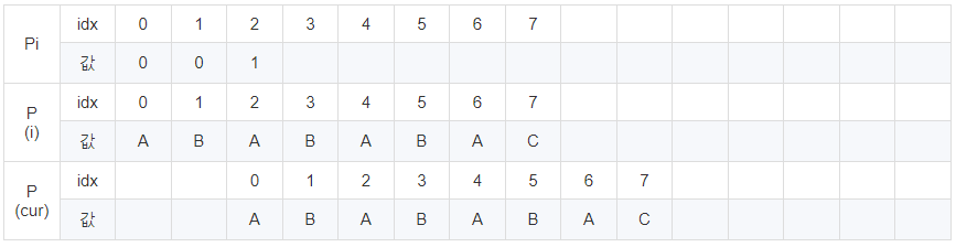 cur이 8일 때 문자열이 다릅니다. 이때 Pi[7] = 6이므로 cur에 6을 대입 후 반복해줍니다.