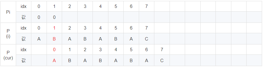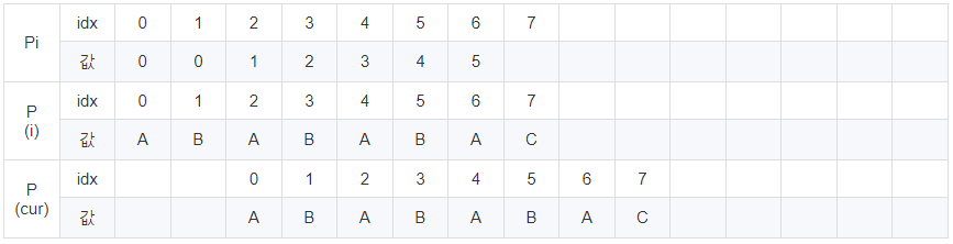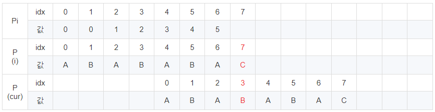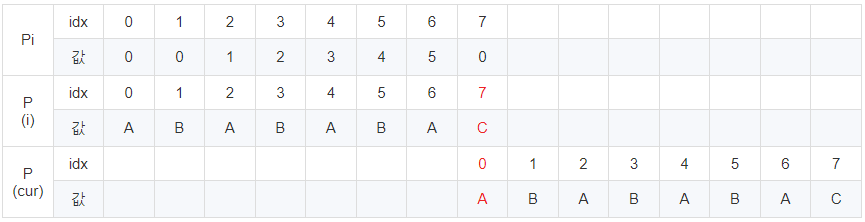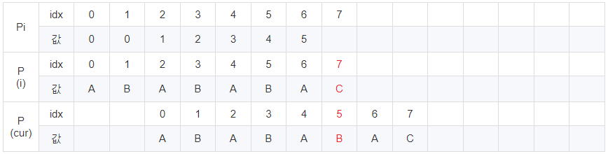 cur이 6일 때 문자열이 다릅니다. 이 때 Pi [5] = 4이므로 cur에 4를 대입 후 반복해줍니다.