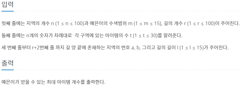 낙하 지역을 1부터 n까지 다 돌면서 데이크스트라를 적용시켜주면 됩니다. 거리 내에 있는 지역들을 들르면서 아이템의 개수를 더해주고, 거리를 벗어나면 continue 해주는 방법으로 문제를 풀었습니다.