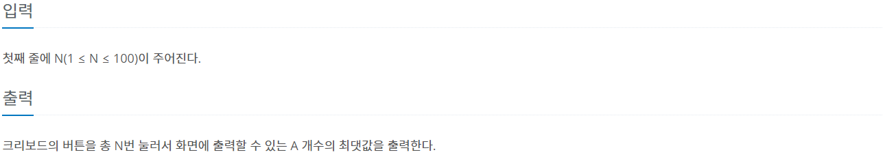 N = 3인 경우에 A, A, A를 눌러 A 3개를 출력할 수 있다. N = 7인 경우에는 A, A, A, Ctrl-A, Ctrl-C, Ctrl-V, Ctrl-V를 눌러 9개를 출력할 수 있다. N = 11인 경우에는 A, A, A, Ctrl-A, Ctrl-C, Ctrl-V, Ctrl-V, Ctrl-A, Ctrl-C, Ctrl